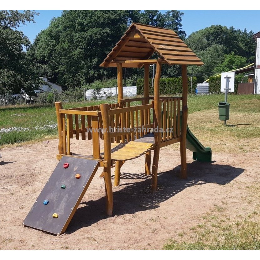 Skládá se z jedné věže se střechou, oploceného mostku, šplhací stěny a žebříčku. K doplnění sestavy doporučujeme přikoupit laminátovou skluzavku, kterou najdete v souvisejících produktech. Skluzavka není součásti.