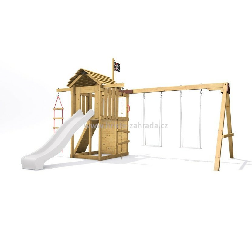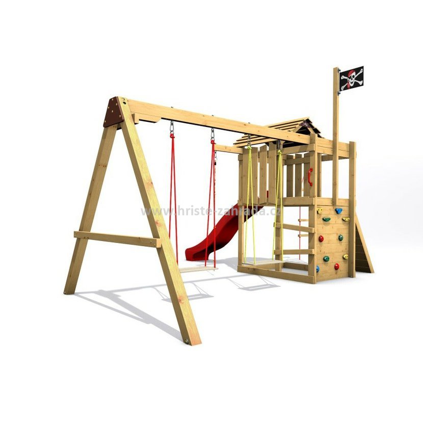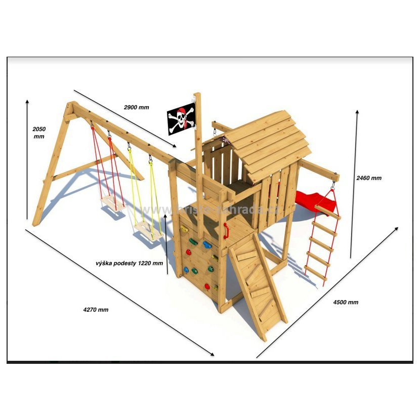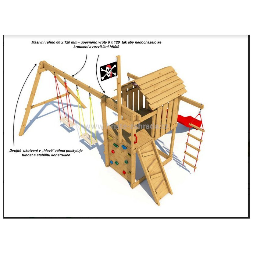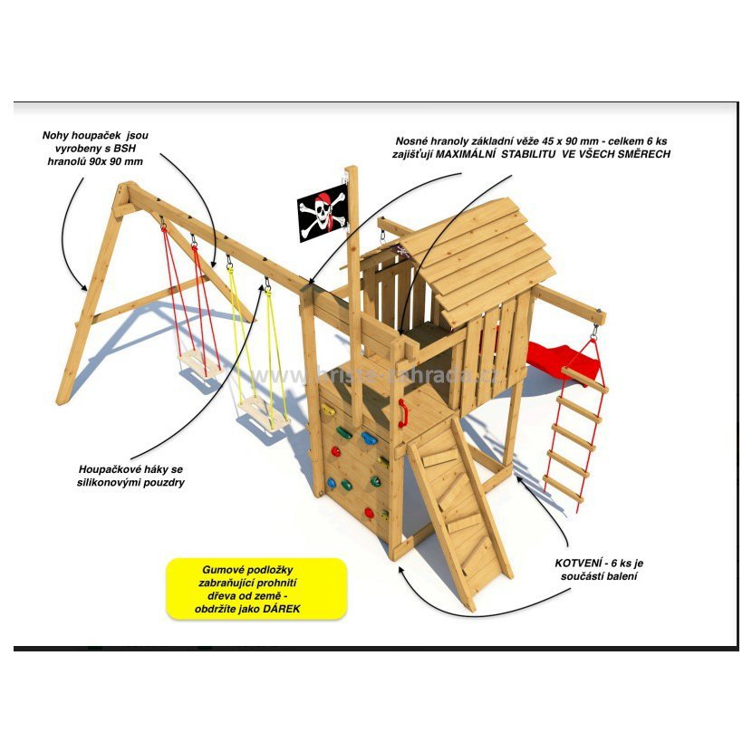 Hřiště doplňuje prodloužené ráhno na obě strany s provazovým žebříkem a šplhacím lanem. Na správném pirátském hřišti nesmí chybět stožár s pirátskou vlajkou. Hřiště splňuje bezpečnostní certifikát EN 71.