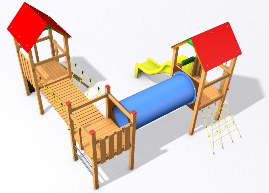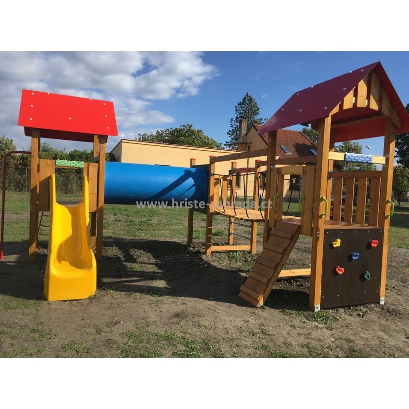 Pěkná herní sestava s kvalitní laminátovou skluzavkou vhodná pro MŠ, obce a restaurace, hotely a školky. Sestava je doplněna lezecí stěnou, tunelovou průlezkou a houpacím hnízdem. Tím mají děti zaručeny dlouhé chvíle zábavy. Dětské hřiště je určeno pro děti od 3 do 14 let, na děti od 3 do 6 let je nutný dohled dospělé osoby.