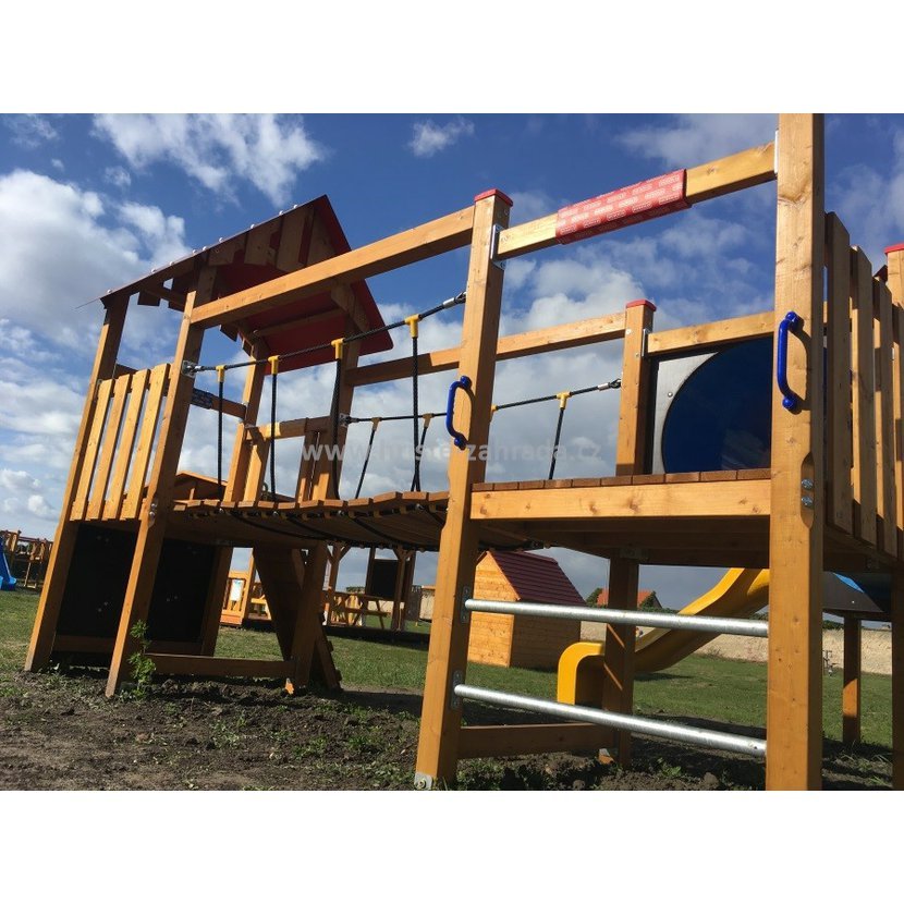Hřiště Monkey's Camelot 11 - 100 Premium obsahuje: 2x věž se střechou, 1x věž bez střechy, 1x spojovací lávka, 1x průlezka tunel (2m) 1x šplhací tyč, 1x šikmá lezecí síť, 1x lezecí stěna, 1x slepičí schůdky.