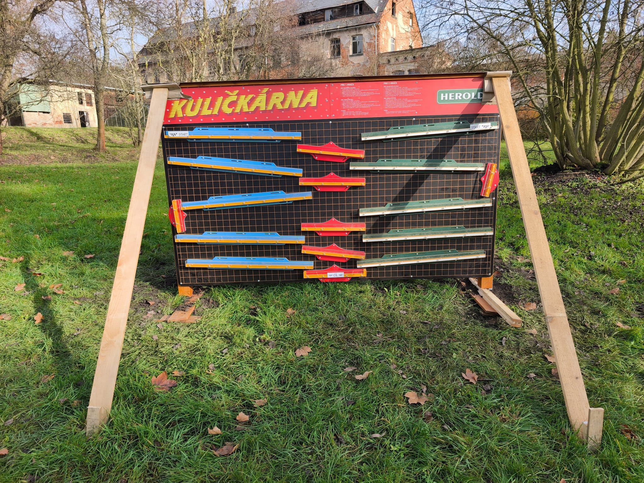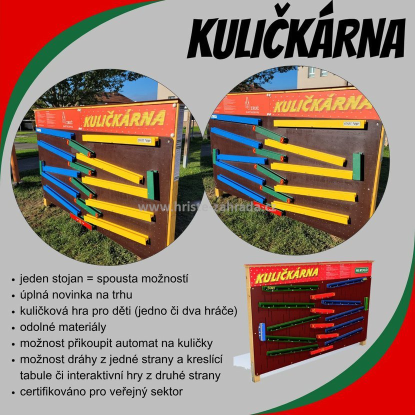 Kuličkárna je unikátní dřevěná hra pro dva hráče, která kombinuje zábavu a kreativitu v jednom. Robustní konstrukce zajišťuje dlouhou životnost a je navržena tak, aby byla ideální pro veřejná prostranství, jako jsou školy, obce či dětská hřiště.