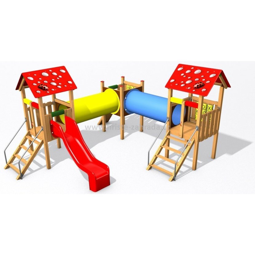 Pěkná herní sestava s kvalitní laminátovou skluzavkou vhodná pro MŠ, obce a restaurace, hotely a školky. Sestava je doplněna herními poli OXO a tubusovými průlezkami, které zaručí skvělou zábavu. Dětské hřiště je určeno pro děti od 3 do 14 let, na děti od 3 do 6 let je nutný dohled dospělé osoby.