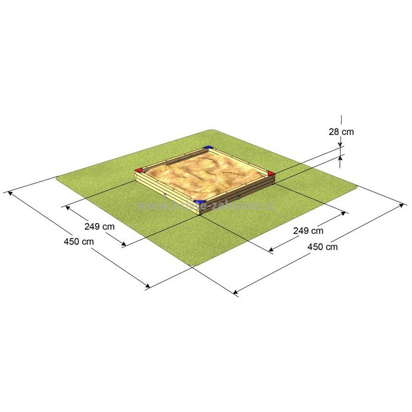 V rozích pískoviště jsou umístěny sedáky z odolného HDPE plastu o síle 19 mm. Barva sedáků se odvíjí od momentální skladové dostupnosti materiálu. Pří požadavku na konkrétní barvu nás kontaktujte, případně svůj požadavek uveďte do poznámky pří odeslání objednávky.