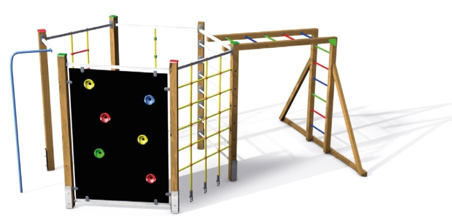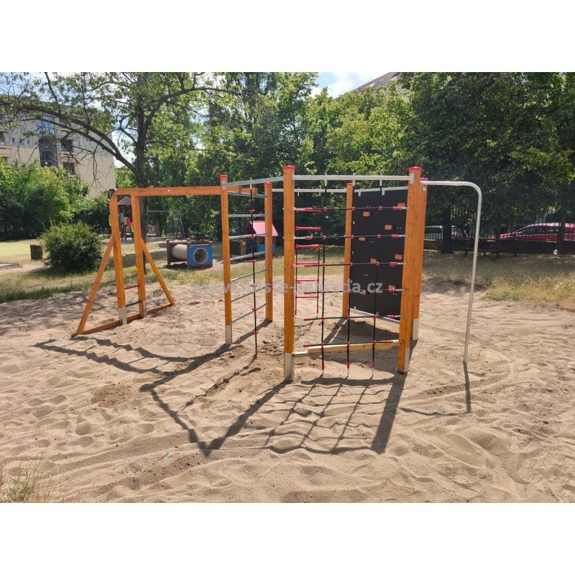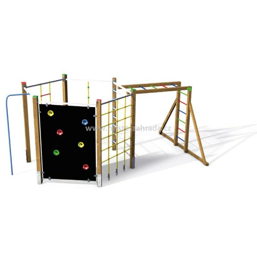 Skvělým doplňkem je i připojený modul složený se svislých a vodorovných žebřin, kde mohou děti ručkovat na kovových příčkách, tím trénují ohebnost a sílu rukou.