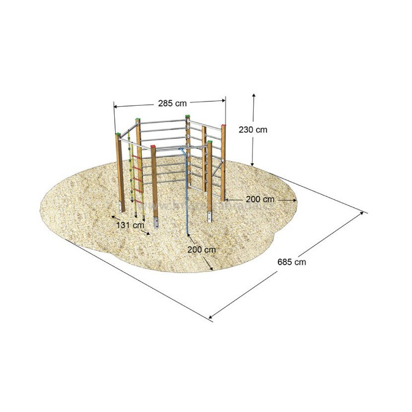 Robustní šplhací sestava Fairway 7 ve tvaru šestiúhelníku představuje ideální volbu pro mateřské školy, obce i restaurační areály. Konstrukce sestavy nabízí šest různorodých hracích polí, která dětem přinášejí jak zábavu, tak přirozený rozvoj pohybových dovedností.